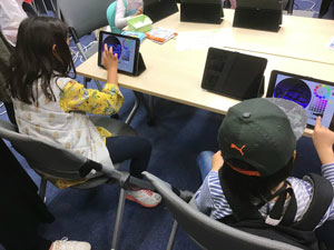体験コーナーでは、ビスケットやスクラッチ、迷路脱出プログラミングの講座を開催。小学校低学年の参加者は、自分で書いた絵が動き出す「ビスケット講座」に興味を示し、真剣な眼差しで受講していました。