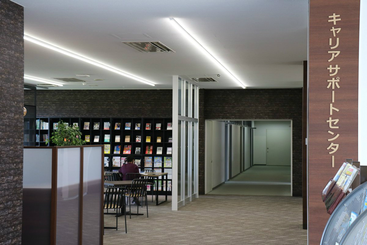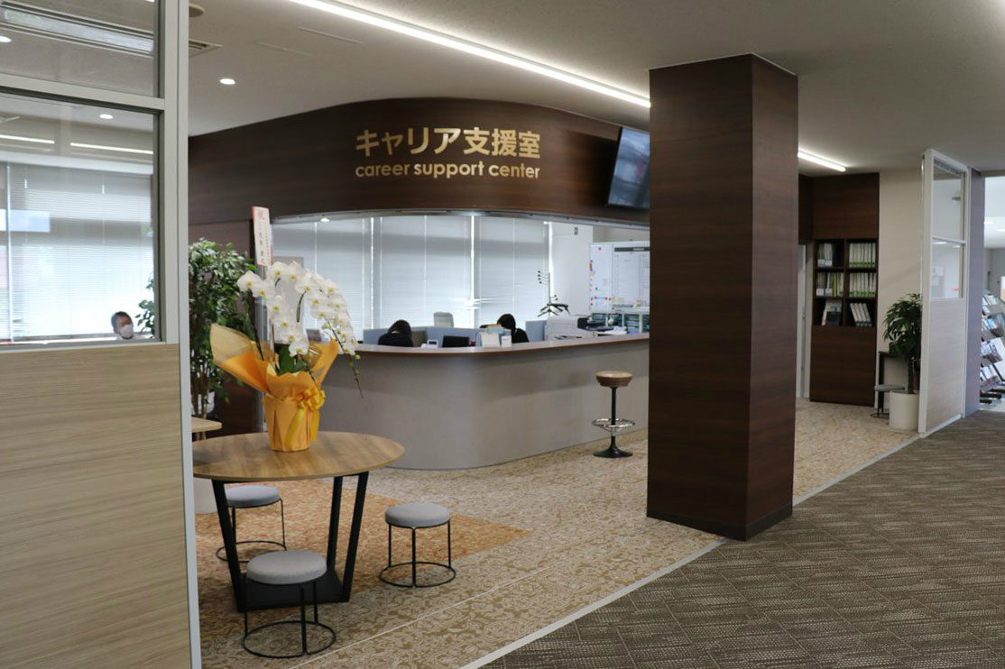 学生相談等で手狭になっていた「キャリア支援室」の増床・改修工事を実施し、あらたにキャリアサポートセンターを新設しました。壁を取りオープンスタイルで多くの学生が集まりやすくなりながらも、個室も設置し、よりプライバシーに配慮した相談やガイダンスの開催が可能となりました。