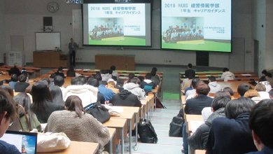 学生一人ひとりに、自分自身のキャリアと社会との関わりを考えてもらうためのガイダンスです。働くことの意味、そして勉強から資格、課外活動など、いかに学生生活を充実させるかを中心にアドバイスします。