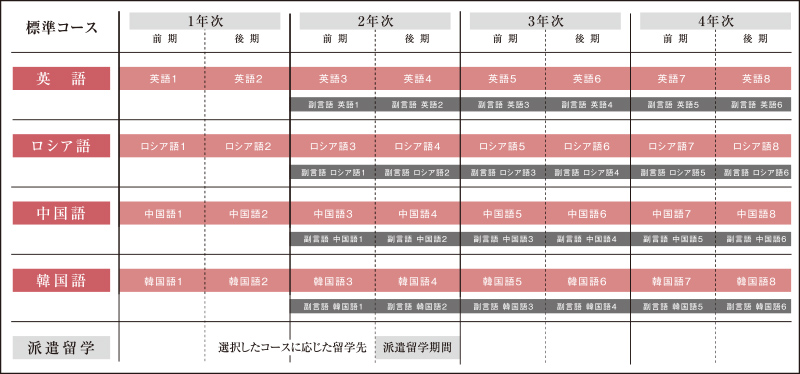 | 派遣留学 | 選択したコースに応じた留学先 | 派遣留学期間 | ||||||