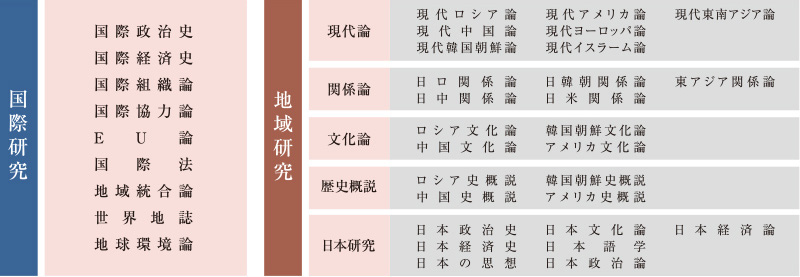 国際社会への認識を深めるために、国内外の文化科目を中心としながら政治や経済の視点も取り入れ、世界の動向に対して反応できる知識と教養が身につけられるような科目を配置しています。