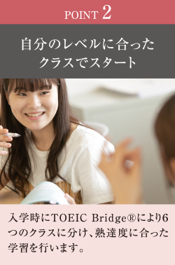 入学時にTOEIC Bridge®により6つのクラスに分け、熟達度に合った学習を行います。