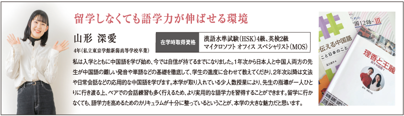 中国に関わる研究を始めたのは大学時代。漫画『キングダム』にも登場する「楚jという固の成り立ちからでした。大学院では中国の哲学を学び、その後上海にある華東師範大学に留学。対象を民俗学 に広げ、 13年間学び帰国しました。本学で担当している「中国文化論」や「日中関係論」では、上海での体験を織り交ぜながら、本やSNSでは分かり得ない中国の素の姿も伝えています。ゼミでは、中国文化と日中関係を柱にし、私自身は上海に住む日本人を研究。 約4万人いる日本人の目を通して、過去50年の間に大きく変わった上海の姿を浮かび上がらせたいと思っています。これは、教科書など が教える大きな歴史に対して、いわば小さな歴史。知られていなかった上海が見えてくるのではないかと思っています。そして、学生に強く伝えたいのは、留学に踏み出してほしいということ。旅行が「点」の体験とすれば、留学して住むことで「面」の体験ができる。「百聞は一見に 如かず」は事実です。大きな一歩と構えなくていい。半歩踏み出すつもりで気軽に。留学や中国に興味のある学生を後押ししていきます。