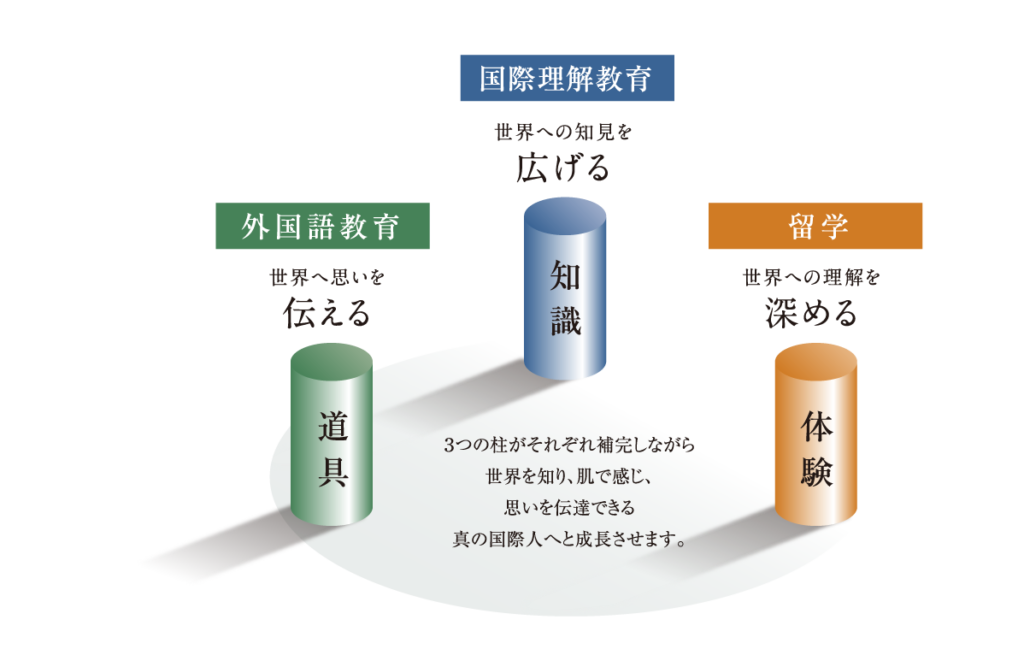 国際理解と外国語の習得、そして留学を3本の柱とした教育を行い