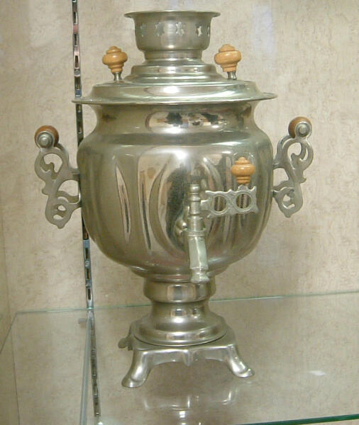 サモワール ロシア・ハバロフスク市にて1970年代購入 ロシアの湯沸かし器。19世紀ごろ紅茶の普及とともに広まったと言われる。 当時は木炭で沸かしていたが、今は電気製品が多い。ロシアン・ティーは、 紅茶を濃く出し(ザヴァールカ)、サモワールから湯を注ぎ、 自分好みの濃さにして、ジャムや蜂蜜、氷砂糖をなめながら味わう。
