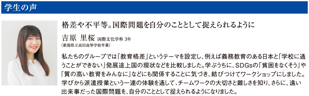 本学は、新潟国際情報大学中期計画Ⅲ(2025~2029)2030-NUISビジョン5に則り、大学の役割として地域社会のための<国際・情報>教育、ビジョンの5番目の柱である「社会に支持される大学」を目指し、地域と有機的な連携をすることによって、新しい教育のスタイルを確立し発信する。グローバルな価値とローカルな価値が融合する「グローカリゼーションの時代」に、幅広い教養に支えられ、変化に柔軟に適応し、自ら考え、たくましい実践力をもち、さらには地域貢献ができる、想像力豊かな人材の育成をする。真の国際人の育成をしていく大学として、国際社会の共通の目標であるSDGsに取組むことで、社会課題に関心を持たせると同時に、国際社会で活躍のできる人材の育成を図る。